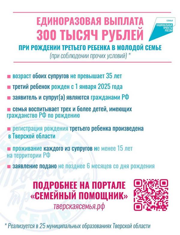 В июле 2025 года в Тверской области стартовала еще одна мера поддержки в рамках национального проекта «Семья»: